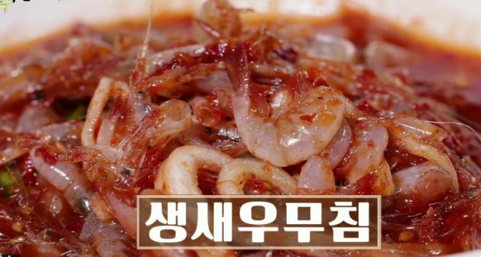생새우 무침은 4월 5월에 많이 나오고 생새우에 멸치액젓, 간 고추, 다진마늘 등을 넣고 무친다. 입안에서 톡톡터지는 맛으로 그렇게 짜지 않다.