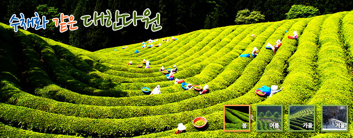 대한다원의 매력은 사계절 모두 다른 풍경을 선물한다는 데 있다. 봄에는 연두빛 찻잎이 살아 숨 쉬는 듯 싱그럽고, 여름에는 장맛비를 머금은 진한 초록이 대지 위에 물결친다. 가을이면 노을과 함께 어우러지는 갈빛 햇살 속에 묵직한 풍경을 만들고, 겨울이면 하얀 눈이 차밭을 덮어 몽환적인 분위기를 자아낸다.